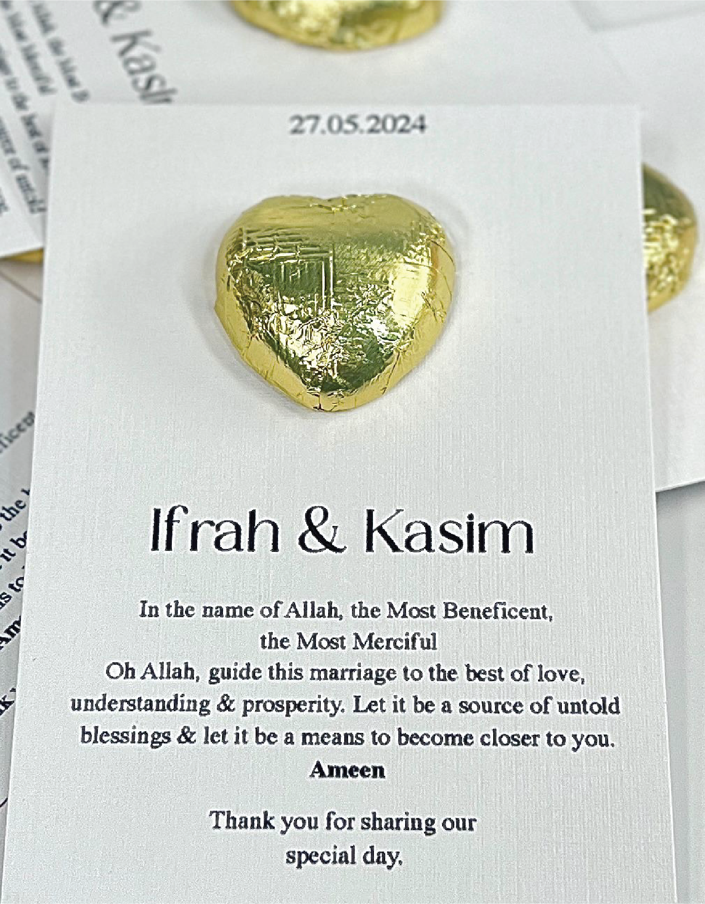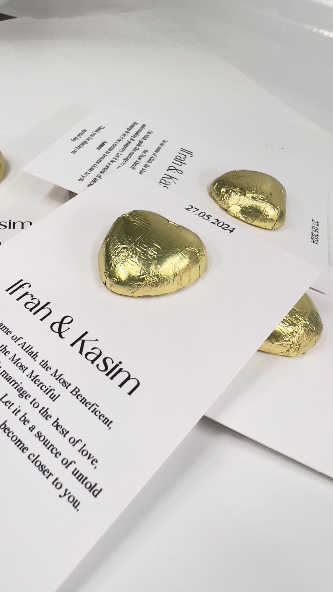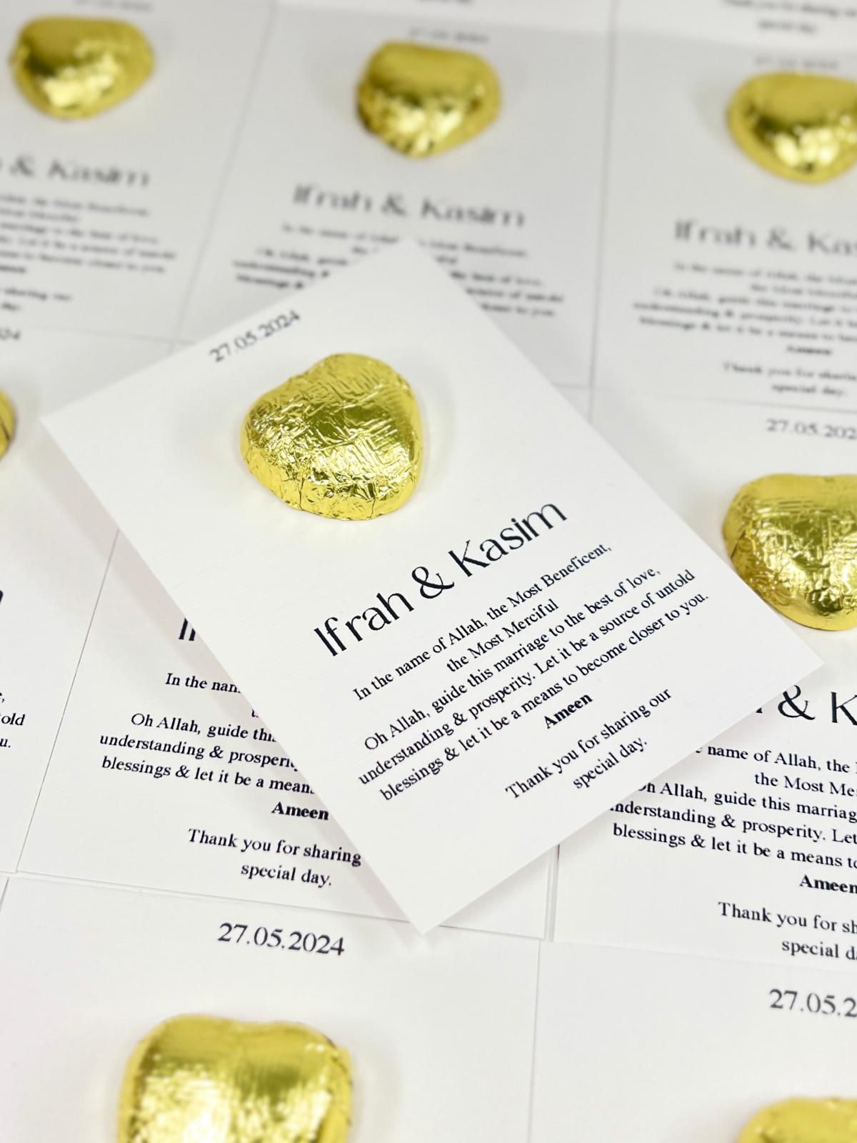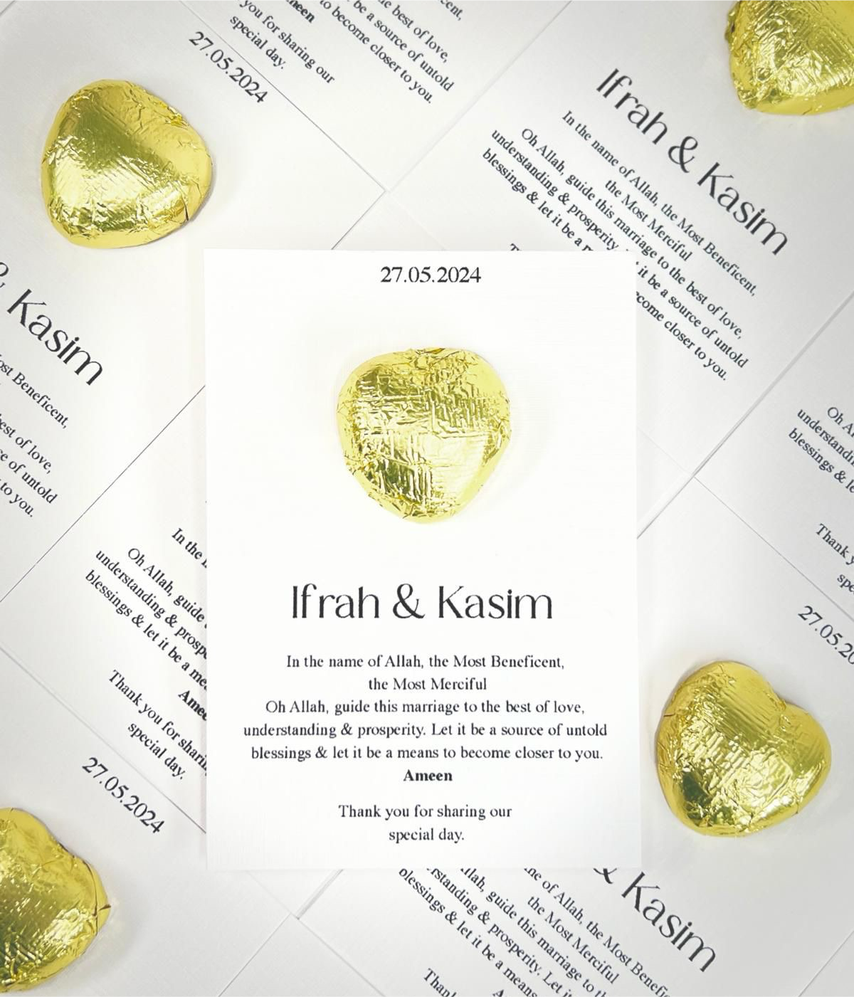 This elegant wedding favour features a gold foil heart chocolate presented on a textured linen card, personalised with names, a date, and a heartfelt message. Thoughtfully designed to add a meaningful and spiritual touch to your special day.