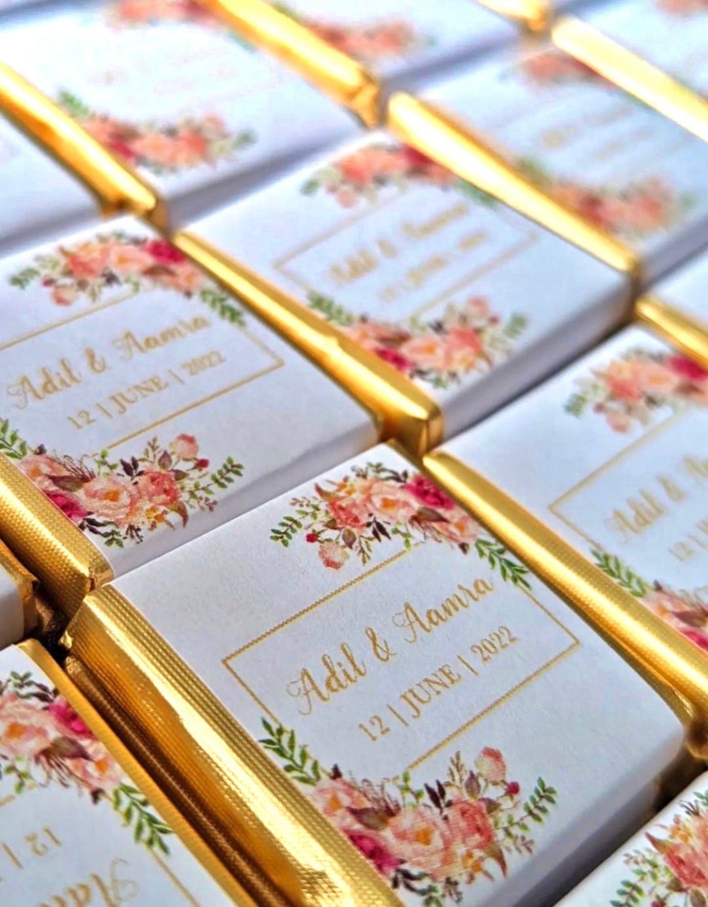 Treat your guests to our wonderful personalised chocolate favours! These delicious treats are the perfect way to add a sweet touch to your special occasion. Each piece is carefully crafted with the finest chocolate and embellished with customizable designs. Our personalised chocolate favours reflect your individual style and taste, with everything from elegant monograms to charming messages. These delightful favours will leave a lasting impression whether you're celebrating a wedding, anniversary, or any other milestone. With our personalised chocolate favours, you can give your loved ones a truly memorable and luxurious experience.